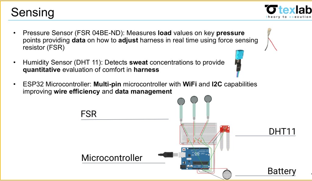 One sensor which allowed better understanding of muscular load was a buckle transducer. Furthermore, a key objective of the design challenge was comfort; however, it was hard to quantify this. Therefore, I attempted to break into the essence of what creates discomfort in the user. I was able to identify that at the highest level, the pressure itself induced heat which could lead to sweat production on the body. We already had a pressure sensor; however, the temperature sensor could identify heat abnormalities due to this pressure, and the humidity sensor could look at the most basic level of determining comfort by identifying regions where sweat was abnormal. Finally when thinking of a microcontroller to use we utilized an ESP32 as it would deal with efficiency with wires in the harness itself to create a less clunky design due to its I2C capabilities as well as having the ability to connect through Bluetooth and Wi-Fi making it easy to connect to and communicate with the device wirelessly. We would power the ESP32 with a 3.7 volt battery.