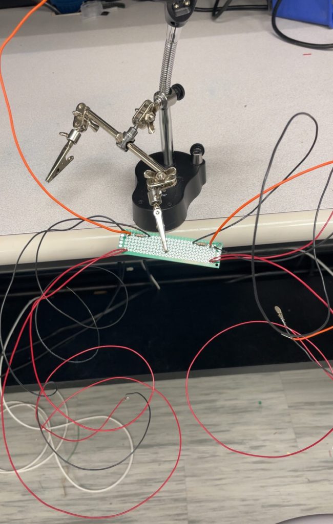 Finally, I soldered my components together. This took a while to do as the soldering on the perf boards was very tricky. I created rail lines for necessary parts such as power and used multiple boards and wires in order to create flexibility and length on the distance between components which could be used to account for varying body sizes. Additionally, I faced an extremely frustrating issue where my components were all of a sudden not reading proper values. I knew my sensors were correct but because I was in the middle of soldering things by replacing their breadboard components it was hard to gauge where a potential error could be. I also had no access to a multimeter at the time as it was late at night and was locked out of the lab but had a MOSFET and LED available so I used the turn on voltage of the MOSFET to test if it would turn on an LED acting as a short or open circuit tester. Although it was a meticulous process it ended up working and I was able to diagnose a hidden open circuit which was faulty in a breadboard rail itself fixing my issue and giving me proper readings.