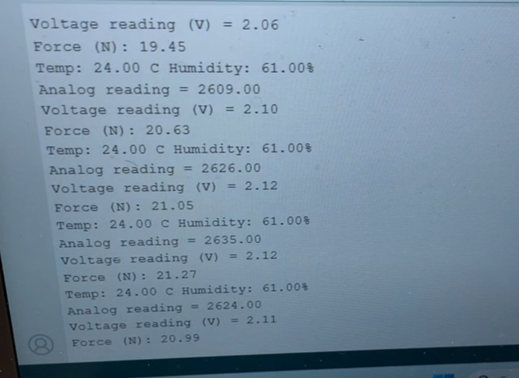 The first technical circuit I had to design was the force sensor. We used an FSR 04BE-ND to measure the force and made a simple circuit using a voltage divider setup. I quickly realized the sensitivity of the values printed by the sensor depended on the resistance we used and found a graph which related the force needed to induce the amount of voltage. The force additionally was given as an output from 0-4095. By using another graph I found online I was able to find the corresponding force in Newtons based on that sensor output value by creating a curve fit equation. I read the values using an analog read pin as well as outputted an analog value (no ADC or DAC needed).